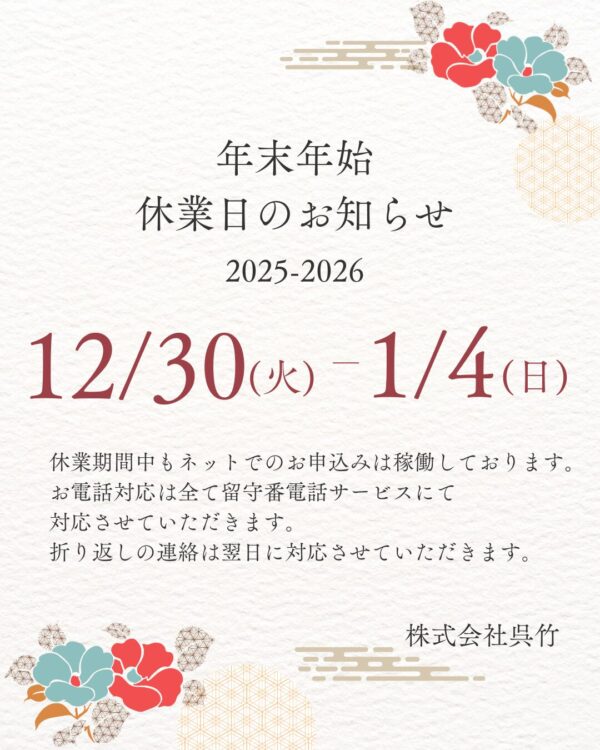 いつもお世話になり、ありがとうございます。本年(2025年)から2026年の年末年始のご案内をさせていただきま…